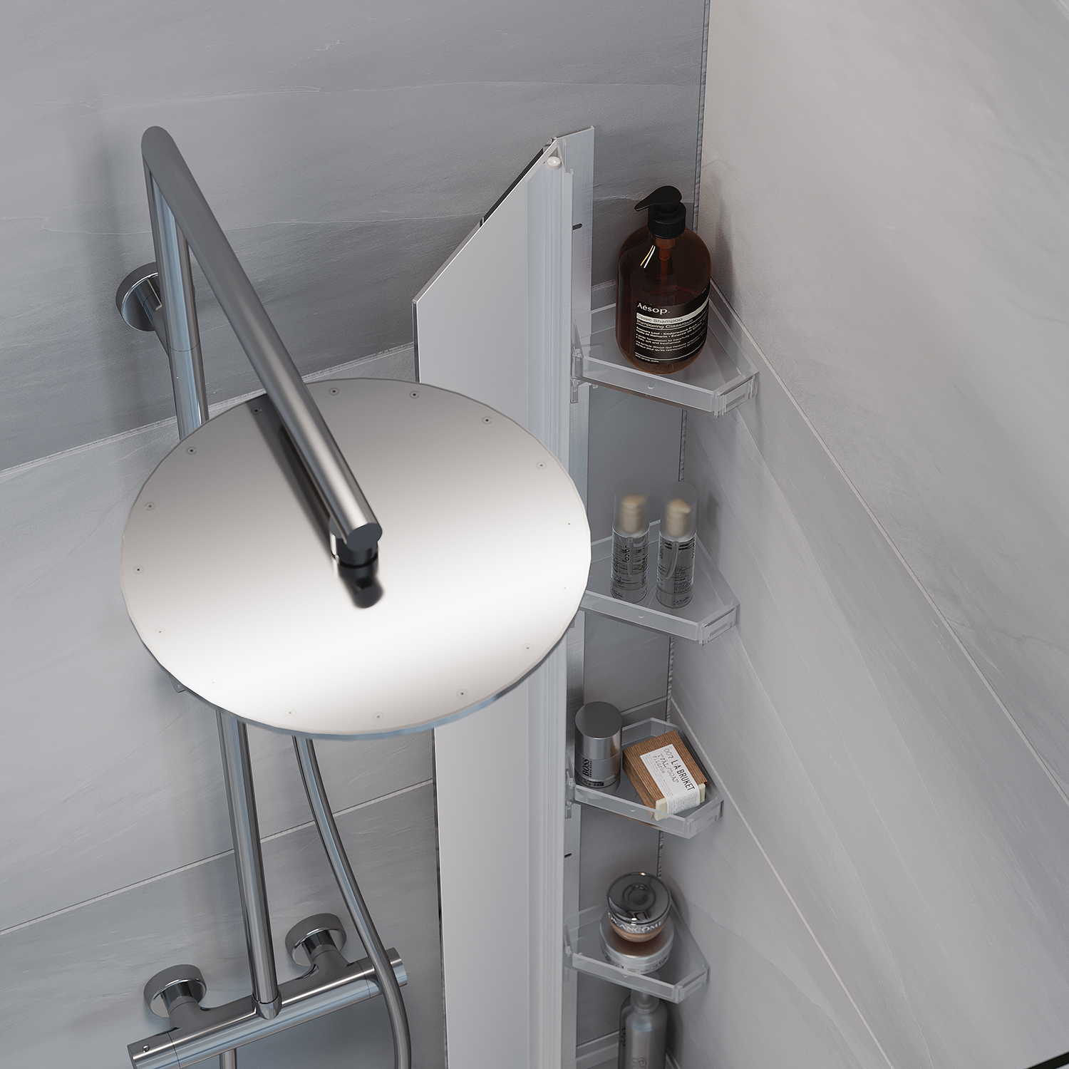 Duschhylla Macro Design Hide är en förvaringslösning för dig som vill dölja dina saker på ett snyggt och praktiskt sätt. Hyllan har justerbara och avtagbara hyllor. Hide monteras i hörnet av din dusch och passar perfekt med Macro Designs duschserier Spirit, Grace, Empire och Flow.