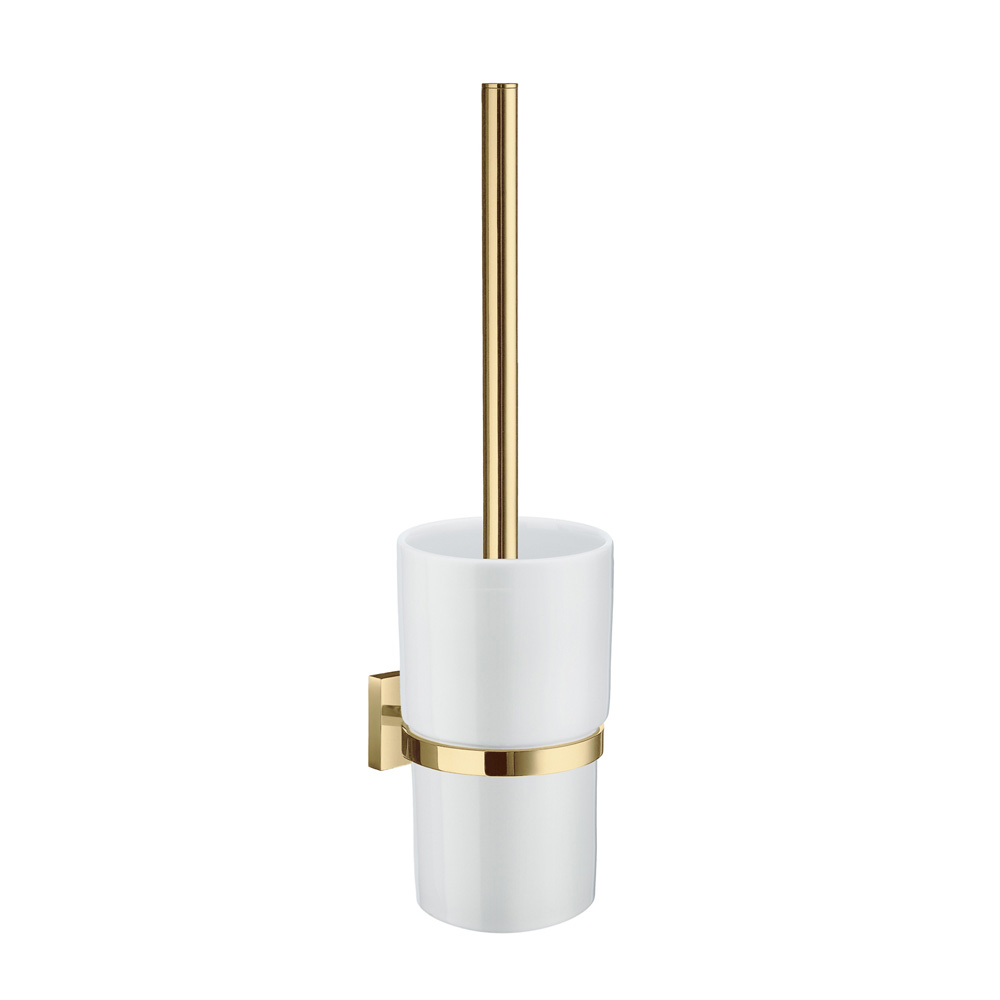 WC-Borste för väggmontering med hållare i polerad mässing och behållare av vitt porslin.